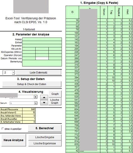 The data are read in, although there may be variability in the number of factors, the measurement parameters and the number of samples. An outlier detection is carried out. A graphic window allows you to "click through" quickly through the measurement results, outliers are marked. The variance components are estimated using an R program integrated in the Excel tool. The results are stored in a separate, printable and storable spreadsheet.
